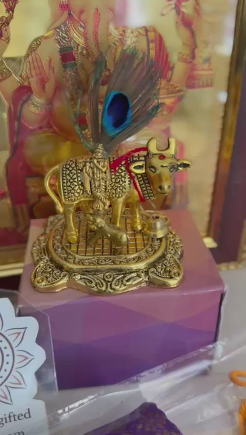 Elevate your gifting experience with this exquisite return gift set featuring a finely crafted brass Kamadhenu. Symbolizing prosperity and abundance, the elegant brass figure adds a touch of tradition and grace to any space. Perfect for special occasions, this set combines cultural significance with timeless artistry, making it a thoughtful and sophisticated token of appreciation.